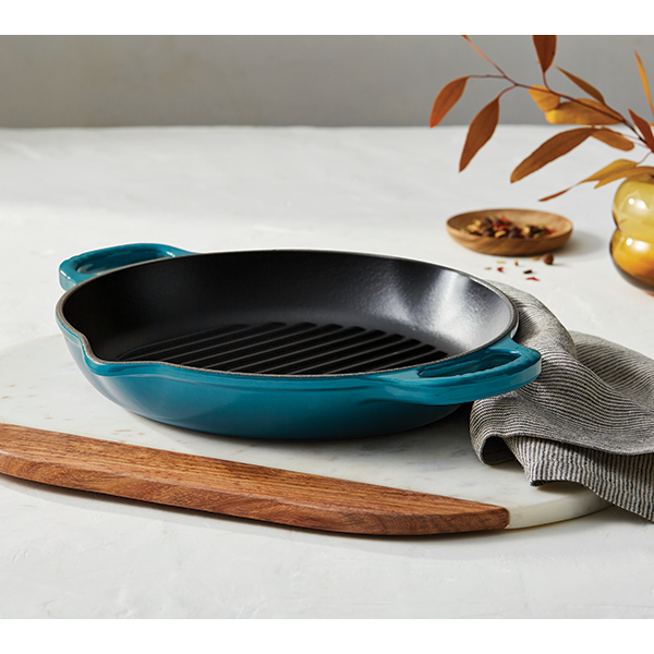Le Creuset's enameled cast iron Deep Round Grill Pan brings the delicious flavor of outdoor grilling conveniently indoors. The interior surface is finished with a black satin enamel that eliminates the need for the traditional seasoning and maintenance of raw cast iron. Specially formulated for higher surface temperature cooking, the enamel develops a natural patina over time that is ideal for searing. The high ridges create perfect sear marks and allow excess fat and grease to drain away from the food. Loop handles make it easy to maneuver a full pan, and the spouts on two sides allow for drip-free pours. Individually crafted by French artisans from the finest quality materials since 1925, Le Creuset enameled cast iron cookware is beloved for its perfect design and exceptional heat retention that produces superior results from stove to oven to table. Designed for generations of durability, the porcelain enamel requires no seasoning, minimizes sticking, and is dishwasher-safe.