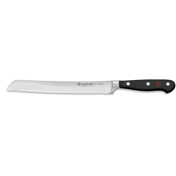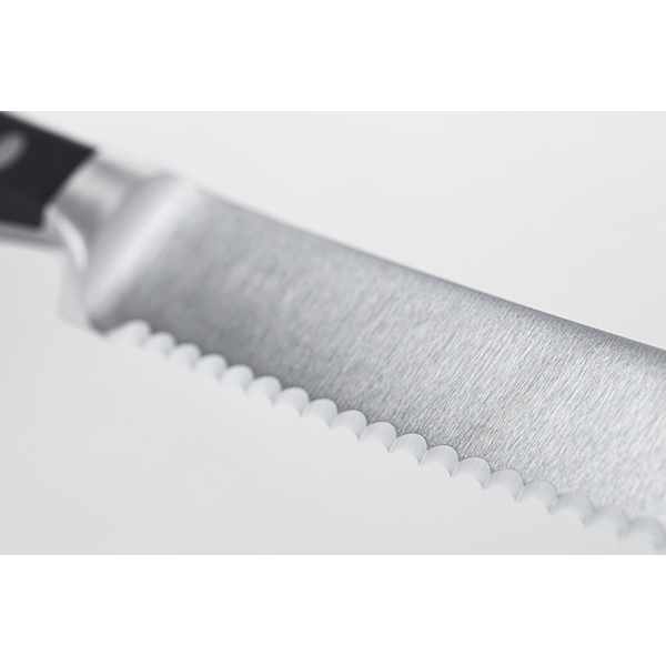 The Wusthof Classic Bread Knife the key to clean slicing through foods with a crusty or tough exterior and a soft interior. Only the classic, points-out serrated edge will bite through quickly, every time. The new Classic Series features the updated Trident logo inlayed on every handle and etched on every blade. It shares the same superior construction of all Wusthof Classic Knives, including full visible tang, classic 3-rivet handle and Precision Edge Technology.