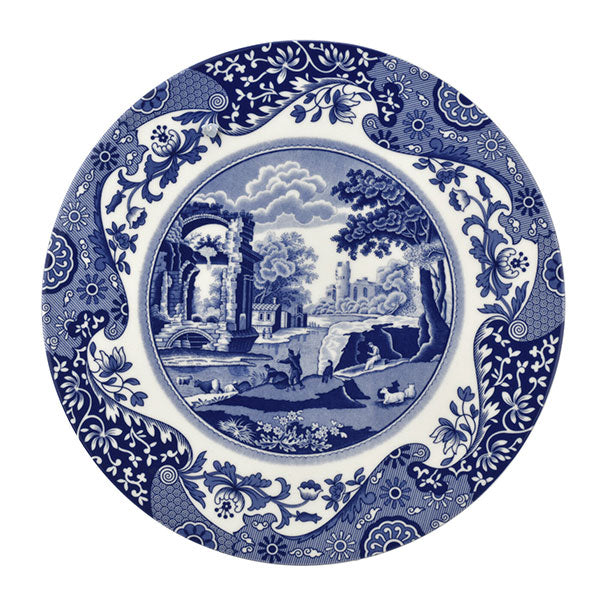 Make a beautiful presentation with the timeless style of the Portmeirion Blue Italian Cheese Plate with Knife. Adorned with a finely detailed blue and white 18th century Imari Oriental border encompassing a stunning scene inspired by the Italian countryside this set will make a stylish addition to your serving pieces. The 9", footed ceramic plate is dishwasher safe. Hand wash only for the 8" porcelain and stainless knife. A beautiful gift idea