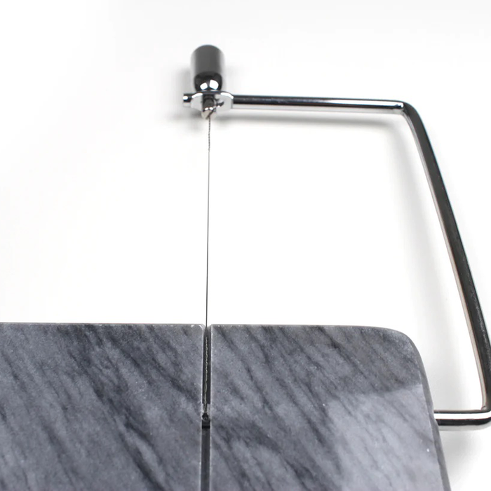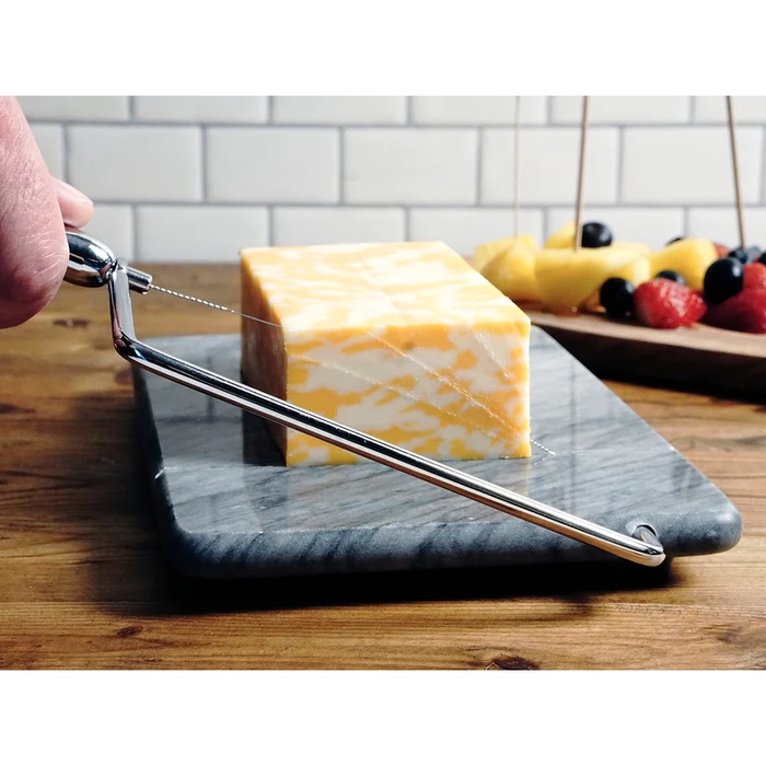 Marble is the traditional choice for serving cheese because it helps keep the cheese cool during service. The Gray Marble Cheese Slicer from RSVP is crafted from a solid slab of natural gray marble and fitted with a chromed arm and cheese wire that neatly slices a variety of soft to medium hard cheeses. The underside has 4 rubber feet that hold the slicer fast while protecting table surfaces, and a chromed slicing handle for a bit more style. The RSVP Gray Marble Cheese Slicer measures 9" x 6" and includes 2 extra wire cutter replacements.