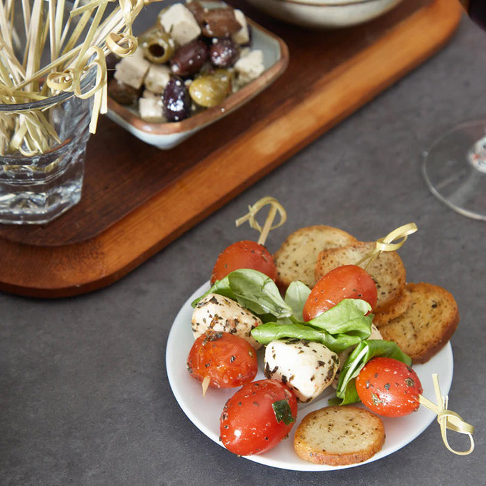 This Set of 50 Natural Bamboo Picks will make a stiking presentation for serving appetizers, hors d'oeuvres, and sandwiches. The 4.5" length is also ideal for charcuterie and other "board" presentations. The natural, carved picks have excellent strength and are easier to hold than the typical "toothpick". Package of 50.