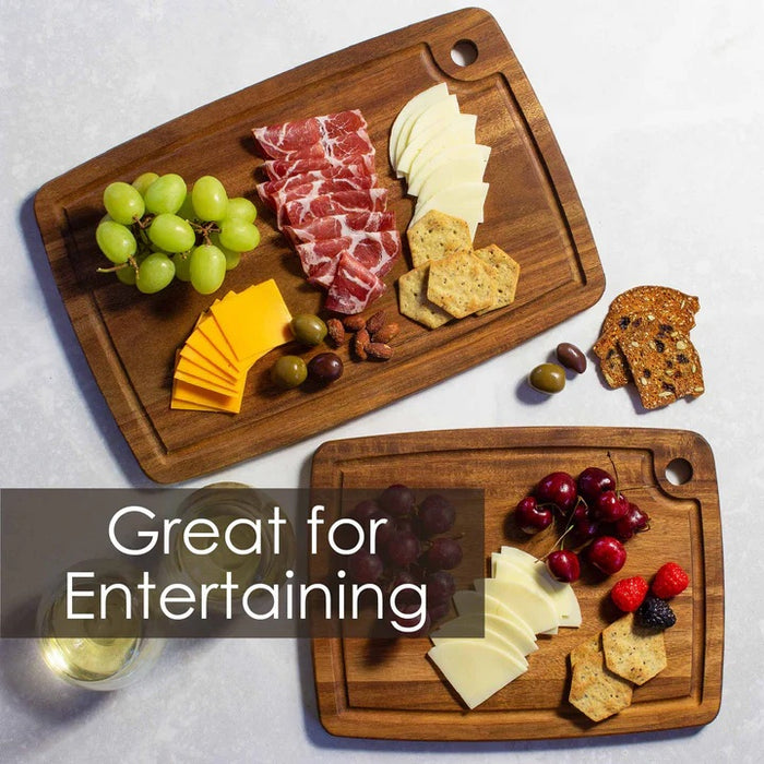 The Totally Bamboo Home 2-Piece Acacia Wood Cutting Board Set is the perfect addition to any kitchen. Beautifully crafted from gorgeous natural acacia wood, these multi-purpose cutting boards are great for everyday prep, carving a roast or mixed grill, and serving charcuterie. The juice grooves that run along the exterior of the boards trap and hold excess juices from roasts, meat, and juicy fruits. With one large and one small board, this set allows you to pick the one that suits your prep best, or use both to help you avoid cross-contamination. They can hang for storage with the integrated hanging hole for easy access. The elegance and functionality of this cutting board will add a touch of style that you reach for daily.