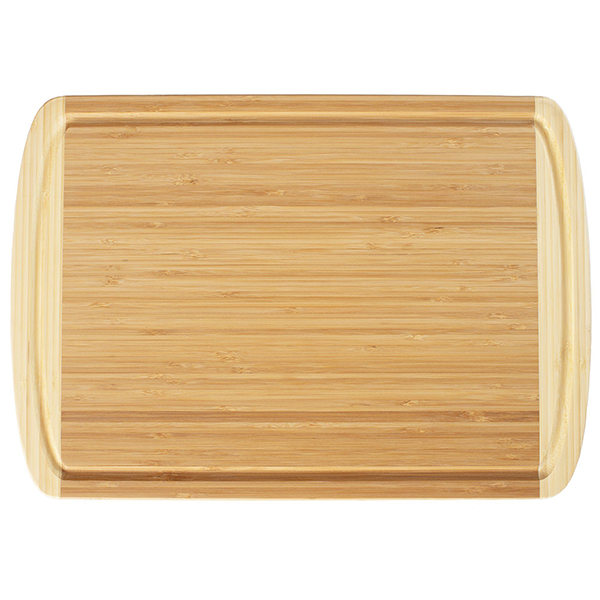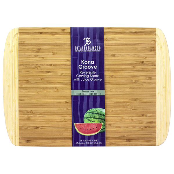 The Totally Bamboo Kona Grove Cutting Board is beautifully crafted from 100% Moso bamboo and is perfect for the kitchen or home bar. The 18" x 12.5" board is lightweight and easy to use, and ideal for salad, cocktail, juice, appetizer prep, and more. With its rounded ends and juice trough, you can dice lemons, limes, melons, oranges, and other watery fruits on the durable bamboo surface, and the liquid will collect in the trough without spilling on your counter or bar top. This cutting board has a rich two-tone design that is distinctly attractive, and since it's made from bamboo, it's super strong. All Totally Bamboo products are made from sustainably sourced bamboo, and their factories adhere to a very stringent protocol for curing and processing the bamboo, ensuring the highest quality product. Hand washing is recommended.