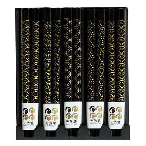 View full detailsThis Miya Set of 5 Black and Gold Chopsticks will be the perfect addition to your sushi feast! Each black chopstick is decorated with a beautiful g...