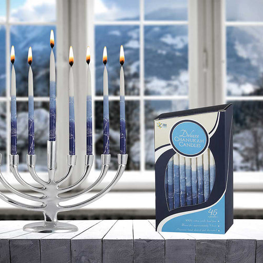 Celebrate Chanukah with these beautiful tapered Blue Elegance Chanukah Candles. This pack of 45 candles is hand-dipped in an elegant white-to-blue ...