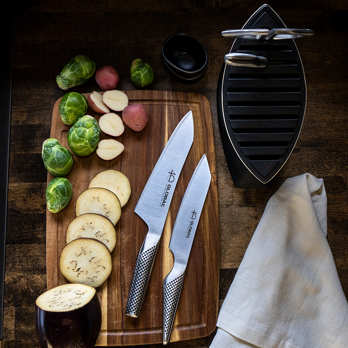 This limited-edition starter set celebrates GLOBAL’s legacy and it's available now, but only while supplies last. This curated set features the anniversary editions of everyday kitchen must-haves, blending form and function - the 6" Kiritsuke Utility Knife, 7" Asian Chef’s Knife, and 4" Paring Knife. All blades are stamped from proprietary CHROMOVA 18 Stainless steel alloy and marked with Global's 40th Anniversary logo. CHROMOVA 18 exhibits exceptional resistance to corrosion, has excellent edge retention and it resharpens with ease. Each thin-ground CHROMOVA 18 blade is beveled on both sides, at a slight 17° angle per side to create a very sharp and fine edge. The blade transitions smoothly and seamlessly into the dimpled, stainless handle that is filled with sand to achieve a precise weight for the perfect balance. Ideal for most any kitchen prep. Made in Japan and backed by a manufacturer's lifetime warranty.