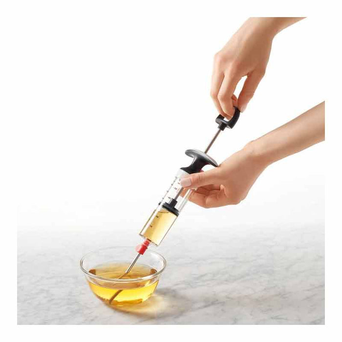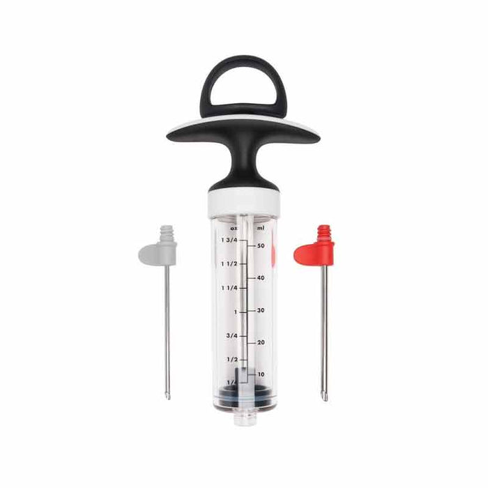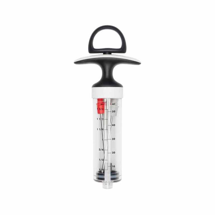Whether you like to season with brines or butter, marinades or minced garlic, the OXO Good Grips Flavor Injector adds more flavor in less time (and it's so easy to use!). Simply fill the BPA-free Tritan body with the marinate or sauce of your choice, using the convenient measurement markings if your recipe calls for it, and inject your roast or bird with delicious flavor. The large, open handle provides a comfortable grip while pushing and pulling at any angle. Two color-coded tips are included: a wide needle for thick marinades and sauces, and narrow enough for thin marinades and melted butter. The needles feature grips to twist on and off, even with slippery fingers, and all parts disassemble for easy, thorough cleaning.