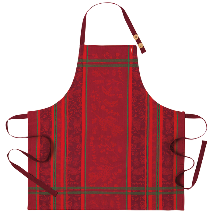 The Now Designs Winterberry Jacquard Apron features a tasteful, woven design in rich crimson hues with contrasting pine-green accents. This full-coverage bib apron is made from 100% soft cotton and features a wider adjustable neck strap with a handsome wood button closure. It's comfortable to wear and easy to care for. Long wide straps ensure a proper fit and can be tied behind or in front. Bar-tacked stress points add long-wearing durability. The Winterberry Jacquard Apron is machine washable and wrinkle and crease resistant. Measures 28" wide x 32" tall.