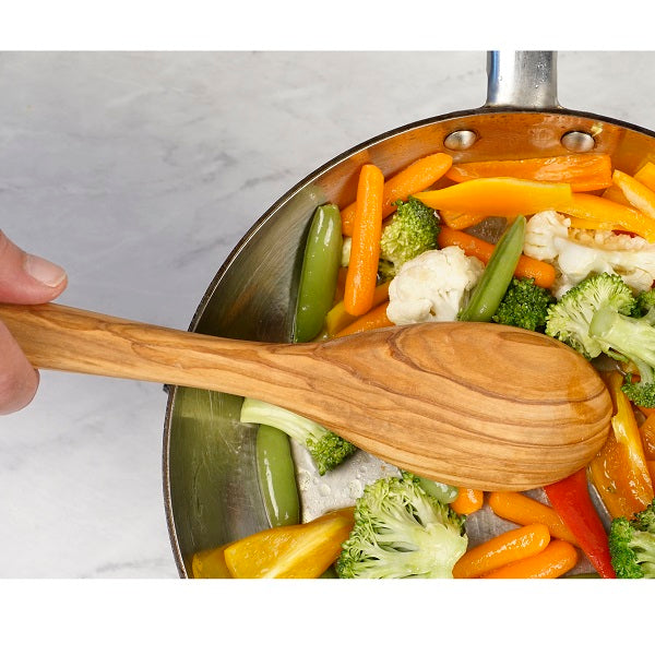 The RSVP Olive Wood Spoon is a beautiful cooking essential carved from Italian Olive hardwood. Ideal for all types of food prep and service, plus it's safe for all cookware, including nonstick. The Olive Wood cooking spoon measures 12.25" long and has a natural wood grain and finish- so no 2 will look exactly alike. Hand wash only.