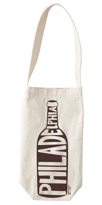 Hit your favorite Philadelphia byob with the Maptote Philly Wine Bag! This 100% natural cotton canvas tote is printed on both sides with a cool Philadelphia wine bottle motif. One side reads "Philadelphia", while the other includes the names of all the great neighborhoods that make Philly so special. The tote will easily hold a standard 750 ml bottle, or a 1.5 L magnum. A sturdy 18" strap makes the tote easy to carry. Machine washable.