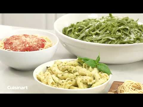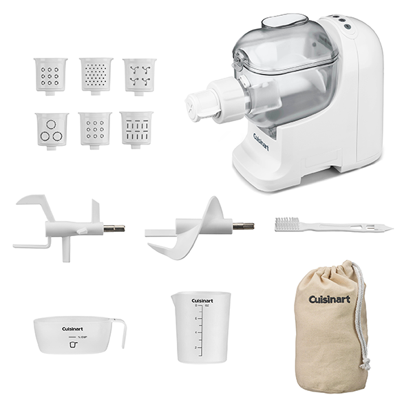 Compact, space-saving, and two functions in one! Impress your family and friends with homemade pasta and breads with the Cuisinart Pastafecto Pasta & Bread Dough Maker. Mix together eggs, flour, oil, and salt and choose from 6 discs to make classic pasta varieties, including spaghetti, rigatoni, fusilli, small macaroni, fettuccine, and bucatini, in only 20 minutes! Get inspired and add ingredients for a pasta recipe of your creation or put the mixer to use kneading small-batch bread dough to perfect, ready-to-rise consistency.