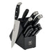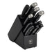 Make a statement with your kitchen cutlery. This Henckels International Statement 12 Piece Knife Set with rich stain is a handsome and versatile addition to your countertop. Created for those craving the look and durability of classic cutlery without the hefty price tag, this Statement kitchen knife set features precision-stamped, satin finish blades with fine, sharp edges that have been coupled with contoured polypropylene handles with an attractive 3 rivet design. The set includes a 3" Paring Knife, 7" Santoku Knife Hollow Edge, 8" Chef's Knife, 8" Bread Knife, Six 4.5" Steak Knife, Sharpening Steel, and a special edition, darker-stain Wood Storage Block. The Statement Collection features durable, full-tang construction and elegantly styled metal end caps, making them as beautiful to look at as they are easy to use.