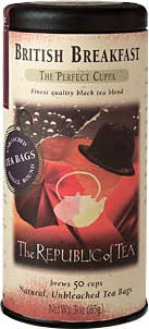 A robust blend of quality black leaves makes the Perfect Cuppa that's hearty enough to make any Brit (or anyone else, for that matter) smile. The Republic of Tea British Breakfast Black Tea contains a savory mixture of China, India, Ceylon and Kenya leaves and is great with a splash of milk. Canister includes 50 Tea Bags.