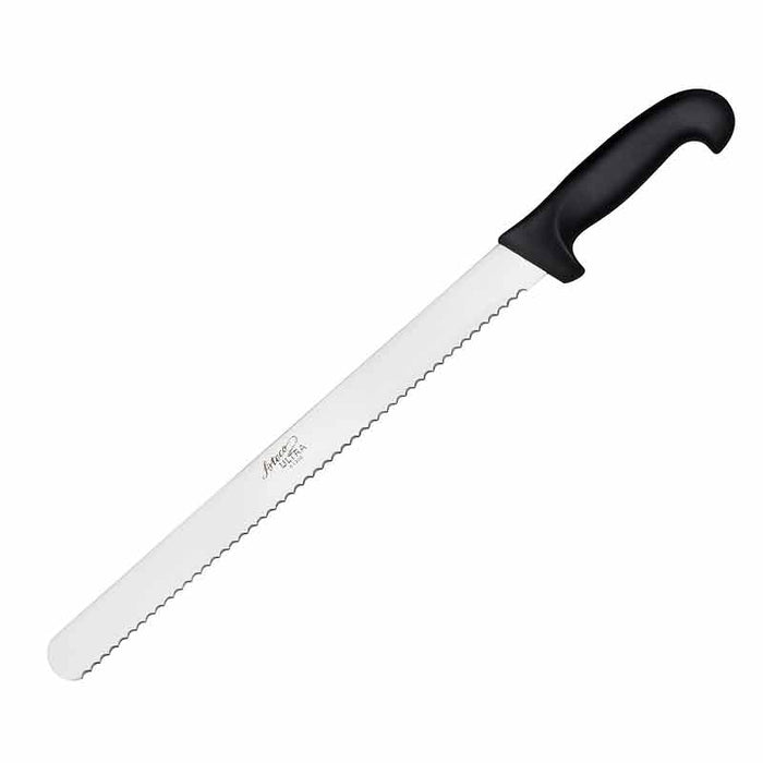 The Ateco 14" Cake Knife is the baker's go-to tool for shaping or slicing even layers of any type of cake to create impressive layer cakes and custom shapes. The long flat blade and serrated edge work together to cleanly slice through delicate crumb while making it easy to keep the blade level and controlled. The 14" stainless steel blade has a molded comfort-grip handle and also cuts effortlessly through other baked goods such as croissants, sourdough loaves and pastries. The Ateco 14" Cake Knife is dishwasher safe.
