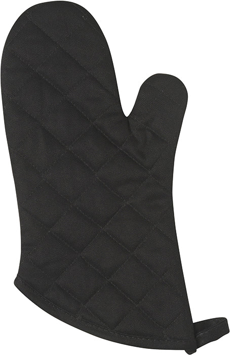 Heavy-duty terry lining inside this Black Oven Mitt will keep your hands protected from high oven heat. The mitt also features heavy-twill binding and a quilted pattern. The Black Oven Mitt is 100% cotton and measures 13" long.