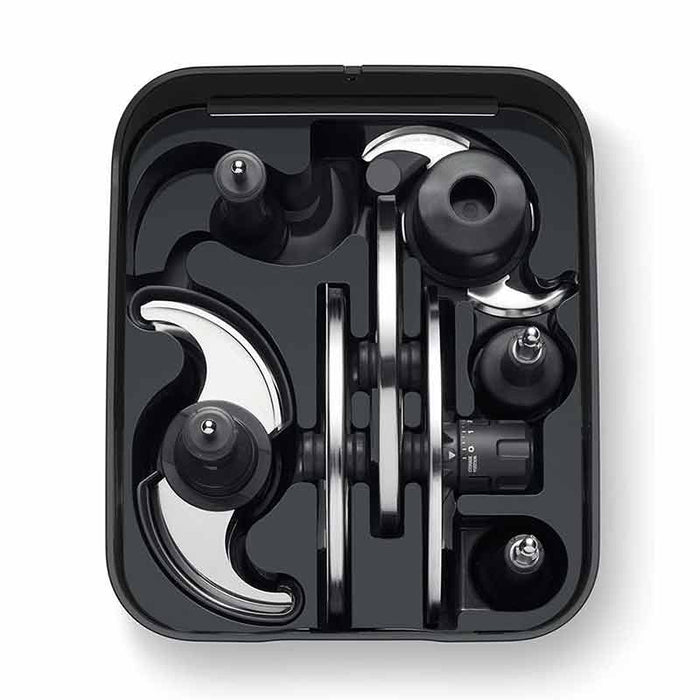 - Includes 24-setting adjustable slicer, reversible shredding disk, French fry disk, micro-serrated S-blade, dough blade, mini blade & 2.5 Cup mini bowl, feed pusher, and cleaning utensils