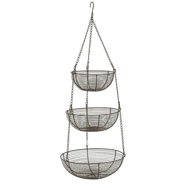 These hanging baskets are perfect for dry, airy storage of fruits and vegetables. Rustic bronzed chain is woven around rib supports to make a sturdy and attractive fixture that comes ready to hang. Baskets measure approximately 8", 10" and 12" in diameter, and have a 31" overall hanging height. Simple hook hrdware allows baskets to be repositioned or removed entirely- classic and versatile storage for the kitchen and home!