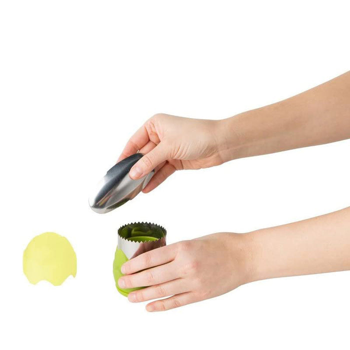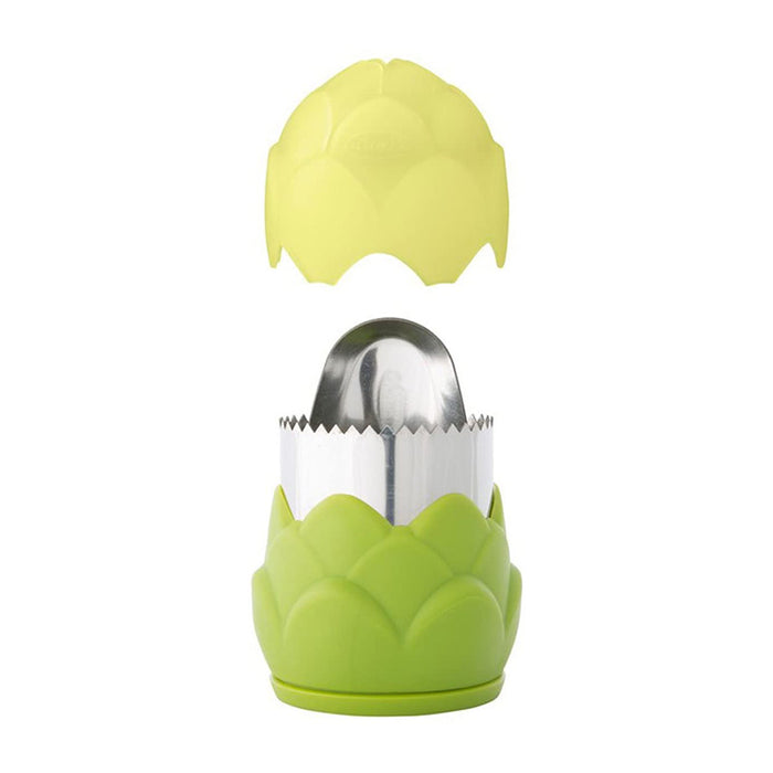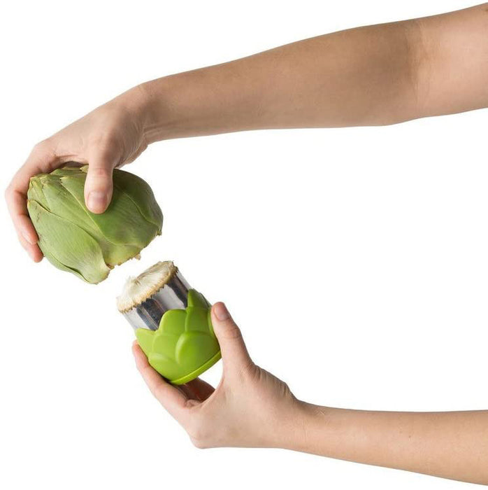 The Chef'n Artichokester is great solution to one of culinary prep's trickiest (and tastiest) vegetables. It quickly saws through the tough outer leaves to reveal the tender heart of the artichoke. There is also an integrated scoop that quickly and cleanly removes the thistley silk (called the choke) from the center. Saves loads of time and effort, and yeilds clean artichoke hearts of consistent size and shape! Scoop and heart blade are made from stainless steel, and all parts are dishwasher safe.