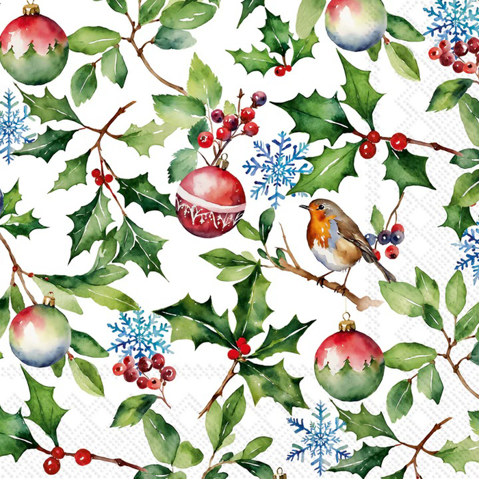 Bright red berries, wintergreen leaves and glass ornaments adorn the cheerful Christmas Holly Paper Beverage Napkins, perfect for holiday parties. The napkins are made of triple-ply tissue and printed in Germany with non-toxic, water-soluble dyes and food-safe ink. They are FSC-certified and made using environmentally-conscious raw materials, which ensures they are both biodegradable and compostable. These napkins bring eco-friendly style and convenience to your tabletop. 20 napkins per package.