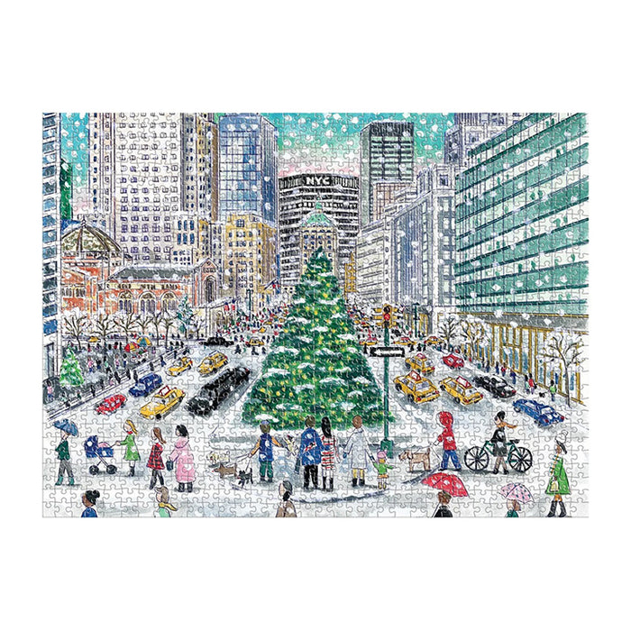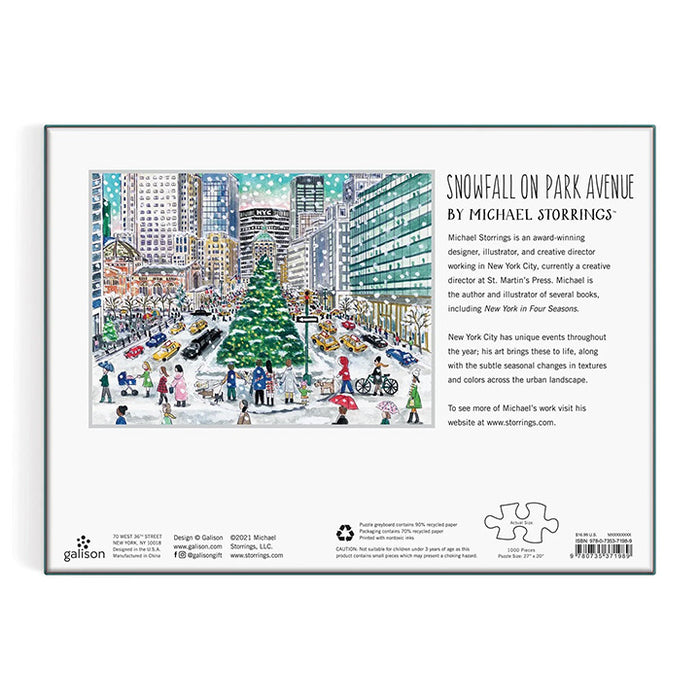 Award-winning designer, illustrator, and creative director Michael Storrings highlights the ultimate winter experience in New York City featuring snow, a lit Christmas tree and holiday shoppers in Michael Storrings Snowfall on Park Avenue 1000 Piece Puzzle. Galison puzzles are packaged in matte-finish sturdy boxes, perfect for gifting, reuse, and storing. An insert of the full puzzle image is also included. 20" w x 27" l assembled.