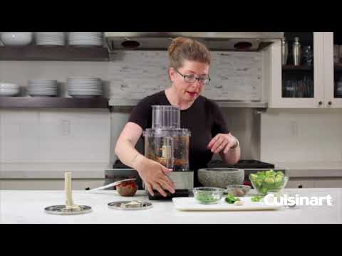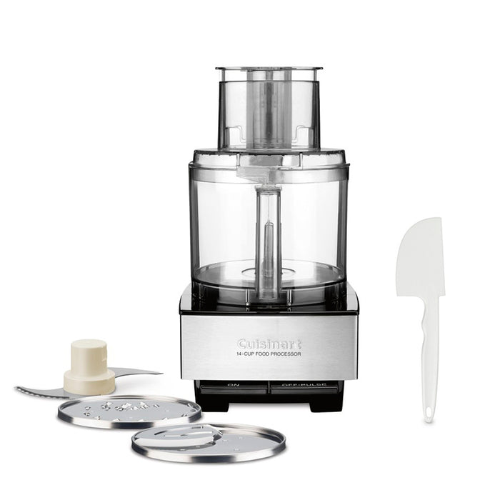 The Custom 14 features Cuisinart's original design with a low, squared-off motor housing and no-nonsense "on" and "off/pulse" paddle button controls. This highly capable processor operates quietly, predictably, and with great stability. The commercially-inspired paddle button design is the original and still the absolute best for this type of appliance. The base is wrapped in handsome brushed stainless steel and houses a powerful, proven, and quiet 720-watt motor that will provide many years of dependable service. The 14-cup work bowl offers ample capacity for large batches of food without overflow, and the safety-locking lid features an extra-large feed tube that can fit ingredients as large as a whole potato so you can spend less time prepping foods for processing. Or you can use the small feed tube insert that will support carrots, celery, and other narrow vegetables. The safety systems ensure safe use, without being too intrusive. Push tubes are included for each tube size and all parts that come in contact with foods are BPA-free, dishwasher-safe, and highly durable. Cutting attachments are all stainless steel and include a 4mm slicing disc, a stainless steel medium shredding disc, a stainless steel chopping/ mixing blade, and a detachable disk stem. The food processor also comes with a rigid bowl spatula, full instructions, and a recipe book. The Cuisinart Custom 14 Food Processor is backed by Cuisinart's full 5-year motor warranty; and a limited 3-year warranty on the entire unit. Measures 11" l x 7.9" w x 14.8" h.