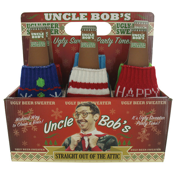 Tacky, wacky and always in the spirit of Christmas, these Beverage Bottle Ugly Christmas Sweater knits make the perfect party accessory and gift! Spruce up your favorite bottles with designs straight out of the attic. The assorted Christmas-spirited styles are so wacky you just have to love them. Complete your look at this year's Ugly Christmas Sweater Party. Great stocking stuffers too. Includes 1 randomly chosen Beverage Bottle Ugly Christmas Sweater design.