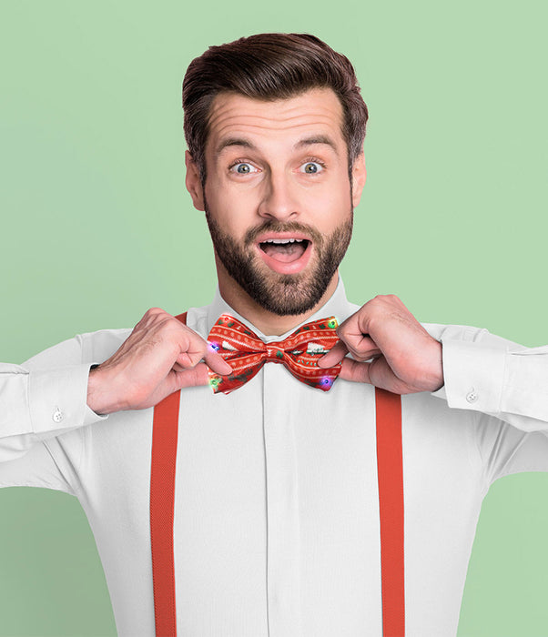 - Holiday-themed bow tie with working multicolor lights