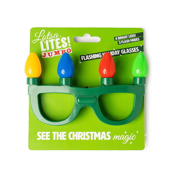 May your holidays be merry and bright with Lotsa LITES!™ Jumbo Flashing Holiday Glasses. These festive glasses have four oversized bulbs with three flash modes. Be the life of the party at your next holiday get-together. Featuring an easy to use on/off switch with 3 flash modes. Batteries included.
