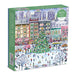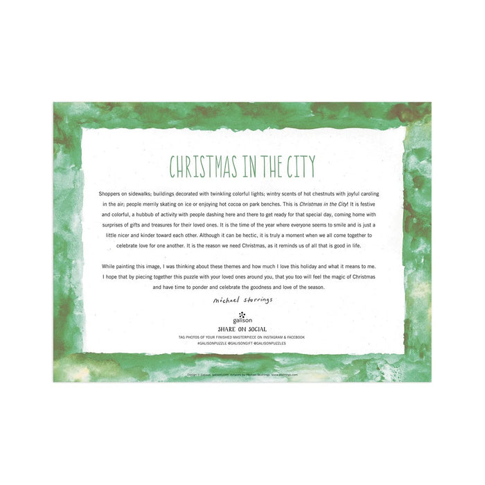 In Galison's Christmas in the City 1000 Piece Puzzle, award-winning illustrator Michael Storrings beautifully captures the magic of the holidays in the city with ice skaters, a Christmas tree several stories tall with brightly lit buildings and skyscrapers lighting the scene. Galison puzzles are packaged in matte-finish sturdy boxes, perfect for gifting, reuse, and storage. An insert of the full puzzle image is also included. 20" w x 27" l assembled.