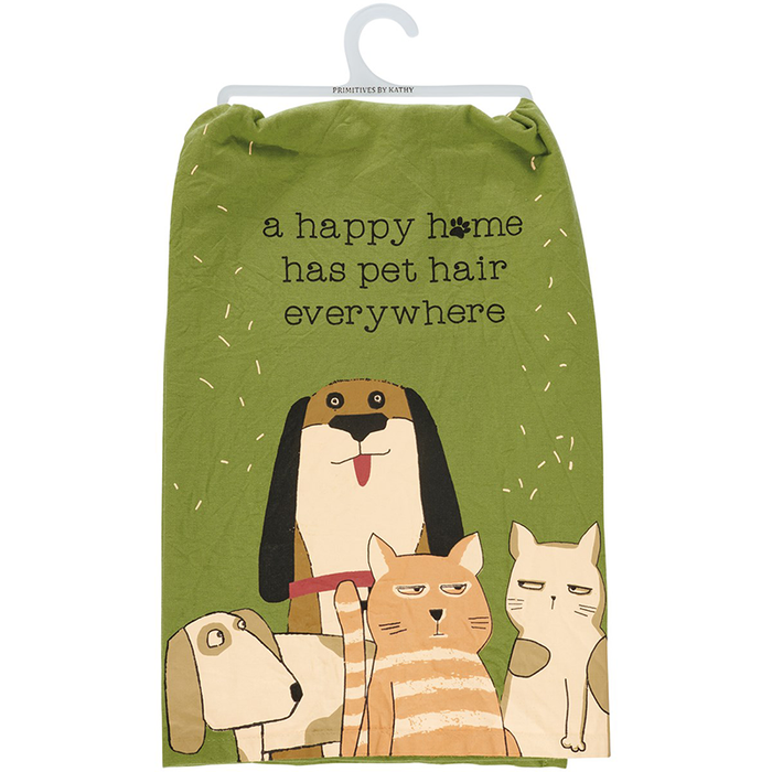 This green cotton kitchen towel is from the Primitives By Kathy Pet Collection, featuring a colorful printed design of sassy cats and dogs (plus pet hair accents throughout the towel). The fun pet-inspired sentiment reads, "A Happy Home Has Pet Hair Everywhere." The Happy Home Pet Hair kitchen towel is conveniently machine-washable for easy cleaning and perfect for everyday use. Machine washable.