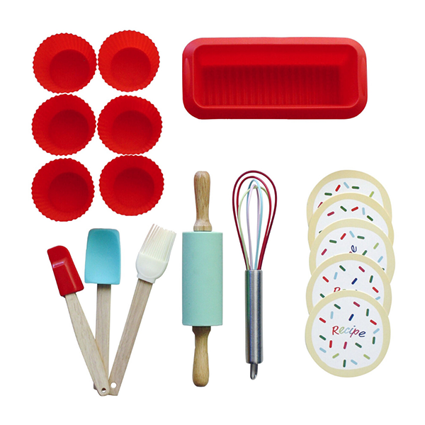 - Includes cupcake Liners, Loaf Mold, 8.5" Whisk, 1.25" Pastry Brush, 7" Mixing Spoon, 6.5" Spatula and 9" Rolling Pin