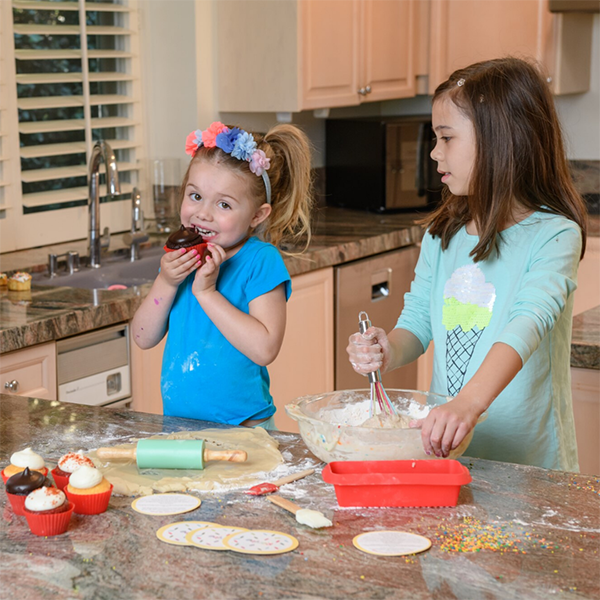 Start your kids on the path to real baking fun with Handstand Kitchen’s best-selling Intro to Baking Set. The Intro To Baking Set features premium quality bakeware and cooking utensils designed to be safe and comfortable for kids ages 6 and up. Durably crafted for real kitchen use, the baking sets and kitchen utensils are reusable and made to last. The Intro Set includes 1 silicone loaf pan, 1 silicone whisk, 1 silicone rolling pin, 1 silicone spatula, 1 silicone pastry brush, 1 silicone mixing spoon, 6 baking cups, and 5 recipe cards. Handstand Kitchen baking sets make thoughtful gifts for birthdays, holidays or just for fun anytime!