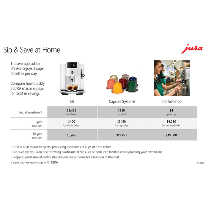 The E8 features the latest 2.8" color TFT display, a Professional Aroma Grinder that guarantees 12.2% more aroma and consistently high grind quality so that flavors unfold to perfection, and the professional fine foam frother for the very best fine-textured foam. It's also wireless-ready and J.O.E® compatible, so it can be used with the included Jura companion app.