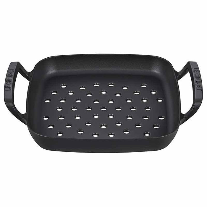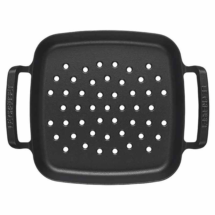 Le Creuset's Cast Iron Alpine Outdoor Grill Basket is designed to go beyond the kitchen, offering a superior searing and roasting option to use on the grill, or even an open fire! The 12" Square Grill Basket has a cast iron construction that is completely encased in a specially formulated, rugged matte black enamel. The durable high-heat enamel is ready to use and requires no seasoning, and is safe for use on regulated and unregulated heat sources up to 842°F!