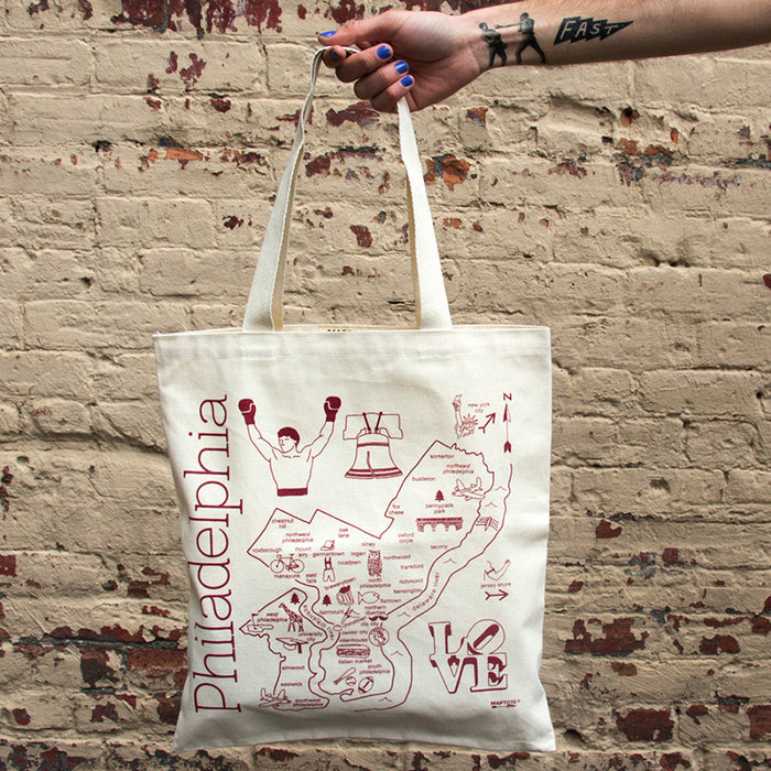Market day in Philly? Or perhaps you know someone who'd like to flash a little Philly pride wherever they go. Get the Maptote Philadelphia Grocery Tote. This 100% natural cotton canvas tote is printed with a line drawing map of the city's most notable landmarks, it's the low-key cool kind of design that can only come from Maptote. The 15.5" x 14" tote is durably constructed from 7 oz. canvas with 21" strap handles so it's really functional for groceries and any type of shopping, as well as hauling necessities to work, school,, or the beach. Plus it's machine washable, as a grocery bag should be. The Maptote Philadelphia Grocery Tote is made in Brooklyn, NY.