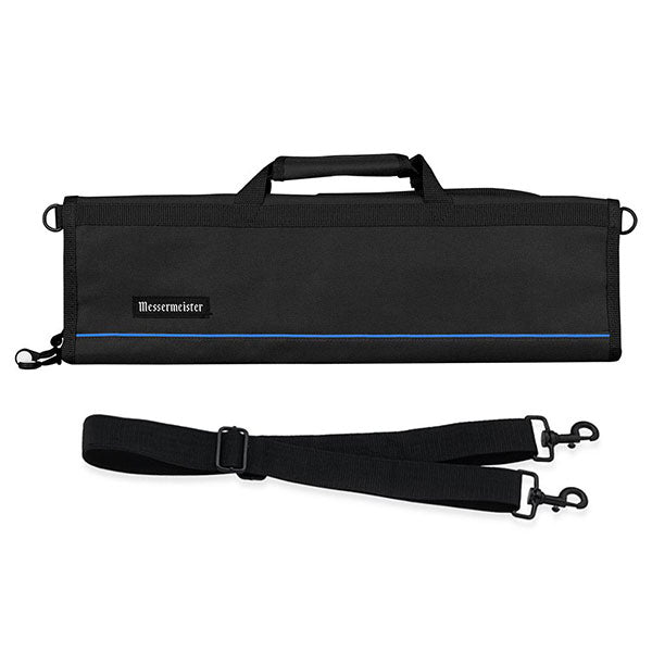 The Messermeister 8 Pocket Knife Roll provides portability and protection to get your knives and other kitchen tools to the restaurant and back- day in and day out. This padded case is constructed of super-tough 600D denier cloth with heavy-duty stitching and zippers. The fabric has PVC backing and a foam core that adds structure and impact protection, and the secure, padded handle is comfortable to hold. An inner cover is equipped with 4 business card pockets, 1 large pocket, 3 pencil/pen pockets, and a zippered mesh interior pocket for small tools. The 8 Pocket Knife Roll is the perfect, not-too-big size that accommodates all your everyday pieces- and it is highly recommended for anyone who needs to travel with fine-edged kitchen knives. It's also great for storing and separating professional kitchen knives away from the everyday family cutlery. Manufacturer's lifetime warranty. Closed measurements are 20" l x 6" w x 1.5" h.