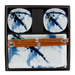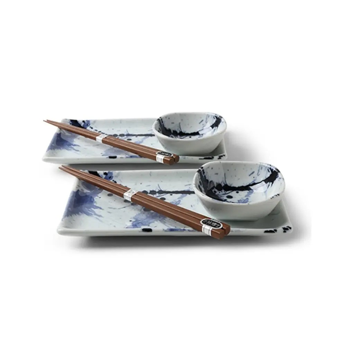 Why not create that restaurant atmosphere at home? Turn take-out food into dine-in food with the Blue Sumi Sushi for 2 Set. Blue glazes are artistically splattered, creating a beautiful pattern that you will love even on the bluest days. The Blue Sumi Sushi Set includes two 8.75" x 5" rectangular plates, two sauce dishes, and two pairs of chopsticks complete a cozy table setting for two. Also makes a nice candle/soap dish set. Packaged in a gift box making it is perfect as a housewarming, hostess, or wedding gift. Made in Japan.