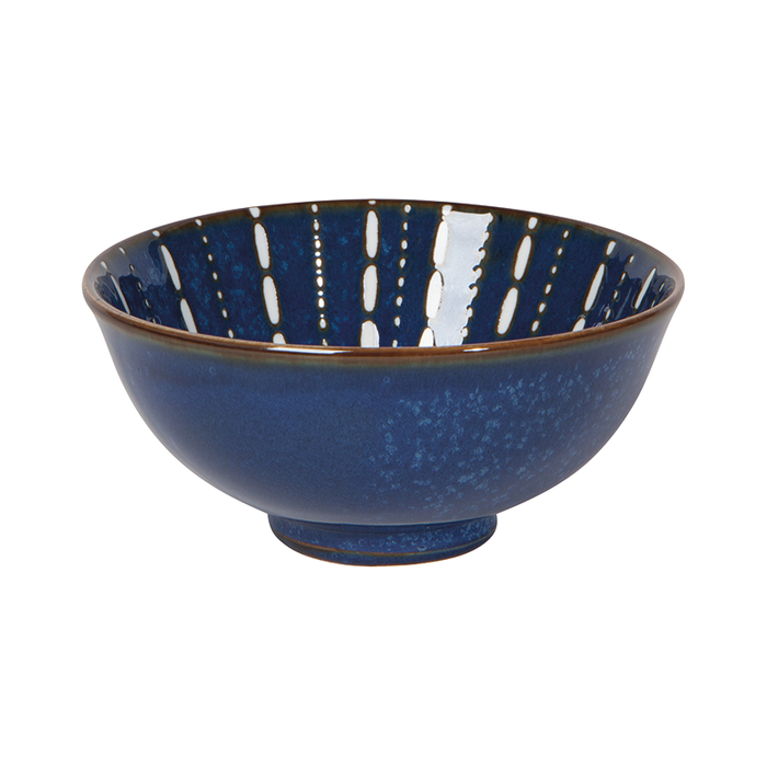 The Danica Heirloom Pulse Stamped Porcelain Bowl is a glazed porcelain piece with global-inspired cues. The interior design is a dance of lines and dots across a shiny blue surface. The deep blue speckled exterior is durably glazed, making it beautiful and practical. The bowl has a versatile 30 oz capacity and a gently flared rim with a hand-made character. The Pulse Stamped Porcelain Bowl is dishwasher and microwave safe.