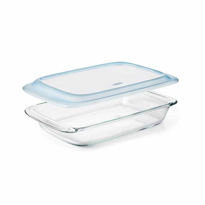 The OXO Good Grips 3 Quart Glass Baking Dish with Lid is made of strong borosilicate glass, built to withstand extreme temperature changes, making it one of the most versatile pieces you can own. It's ideal for baking brownies, bars, and cobblers, roasted veggies or chicken, and baked pasta dishes and casseroles. The premium borosilicate glass construction means you can take food directly from the freezer or fridge to the oven or microwave without cracking. And then to the table, patio or picnic with the included fitted dome lid! This 15.6" x 9.6" baking dish is designed with a generous rim and side handles and includes a BPA-free fitted lid, making for safe and easy transporting. The clean, elegant design is microwave safe, oven safe, freezer safe, dishwasher safe, BPA free, and PVC free.