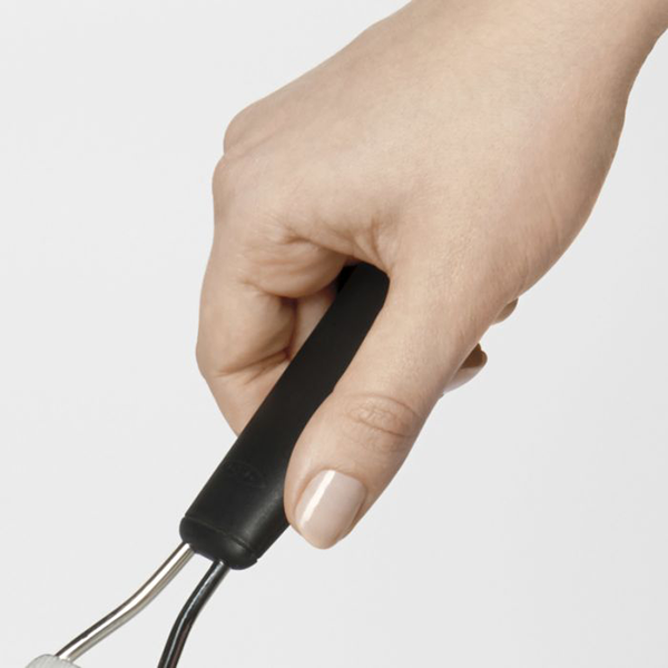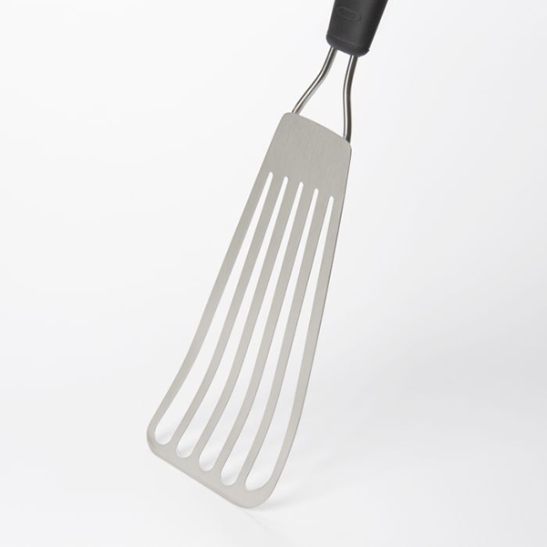 Turning delicate foods is no longer a difficult task when you use the OXO Good Grips Fish Turner. The spatula is ideal for turning and transferring seafood items such as fish filets and crab cakes, steaks and hamburgers, and delicate pastries. The oversized turner features a stainless steel head with slots to allow grease to drain from your foods. The beveled edge will easily slide under your foods. The fish turner also features a traditional OXO Good Grips style handle that is soft and comfortable to use.