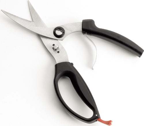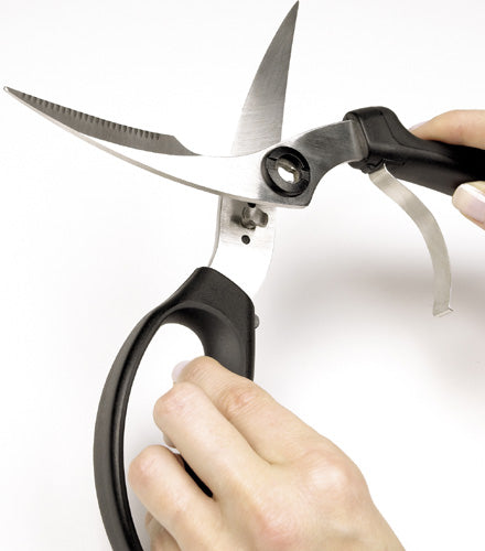 Poultry shears are handy in the kitchen when you want to quickly break down whole birds; ideal for spatchcocking or cutting through small bones and joints while trimming poultry. The OXO Poultry Shears feature soft, comfortable handles that are slip-resistant, perfect for use with wet hands. The spring-loaded handle loop and bolster prevent hand strain. The blades separate for thorough, easy cleaning. The shears feature a lock on the handles that keep the blades closed for safe, convenient storage.