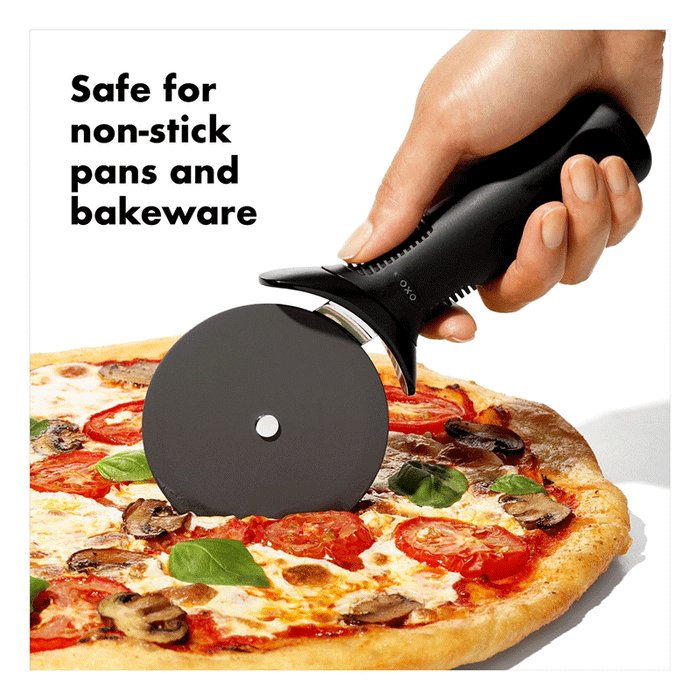 The sharp, tapered blade of the OXO Good Grips Pizza Wheel for Non-Stick Pans cuts through the crust without damaging non-stick baking sheets and pizza pans, which means you don't have to slide your pizza to a cutting board before cutting it! It's also great for cutting brownies, blondies, and other dessert bars right in the pan.  The blade itself has a durable nonstick coating to keep melty cheese from sticking, and the handle is designed with a thumb guard that keeps your fingers safe. The soft, non-slip grip ensures you maintain control when you’re on a roll.