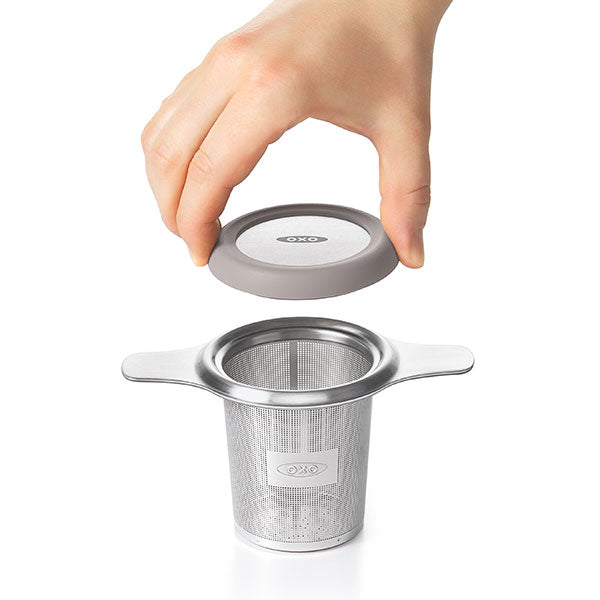 When you want to get the most from your tea ritual, get the OXO Tea Infuser Basket. This pour-through design promotes the fullest infusions that capture the subtle nuances of your favorite loose tea blends. The premium stainless steel infuser is sized for single-cup steeping and made to sit nicely in your cup or mug. Wide handles hold the basket on the rim of your mug and make removal easy. An etched micro-perforation pattern contains even the tiniest particles, while still allowing water and flavor to flow through freely. The stainless lid with stay-cool silicone rim doubles as a drip-tray when steeping is done. Dishwasher safe.
