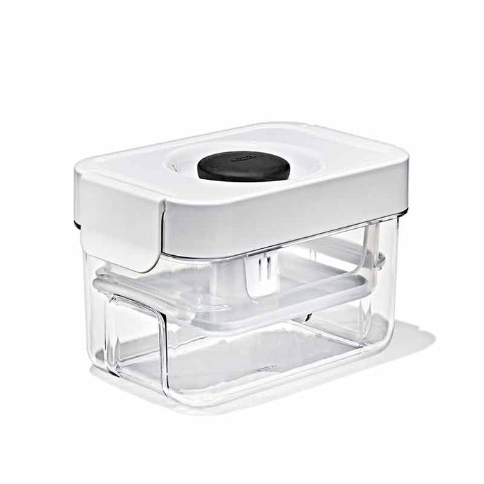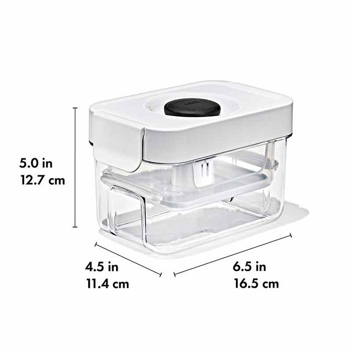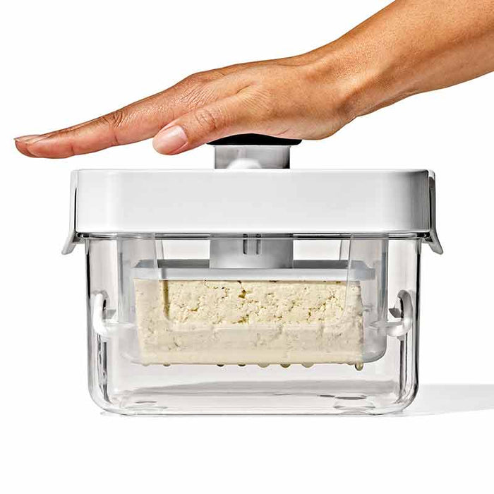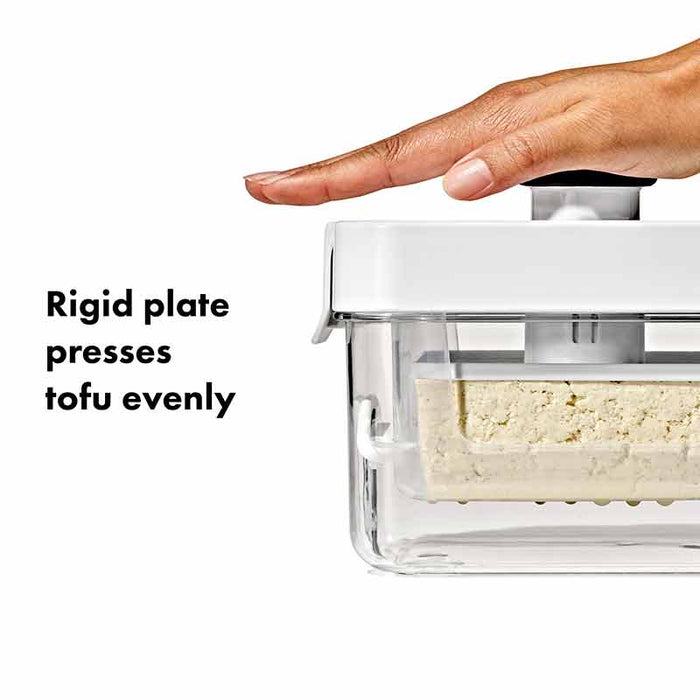The OXO Tofu Press is a superior design for drying and compressing tofu for stir-fry, baking, frying, grilling, and many other techniques. This specialized tool gently and evenly presses tofu, expelling the water and compressing the texture, allowing it to be seared and hold its shape through cooking. The Tofu Press features a single press knob and rigid press plate that ensures an even press with one hand. The knob also has 2 firmness settings that help you achieve the best results for your recipe. The Tofu Press disassembles quickly for easy cleaning, and all parts are dishwasher safe. Measures 6.5" l x 4.5" w x 5" h.