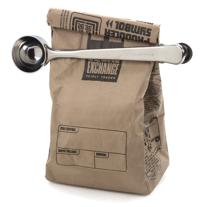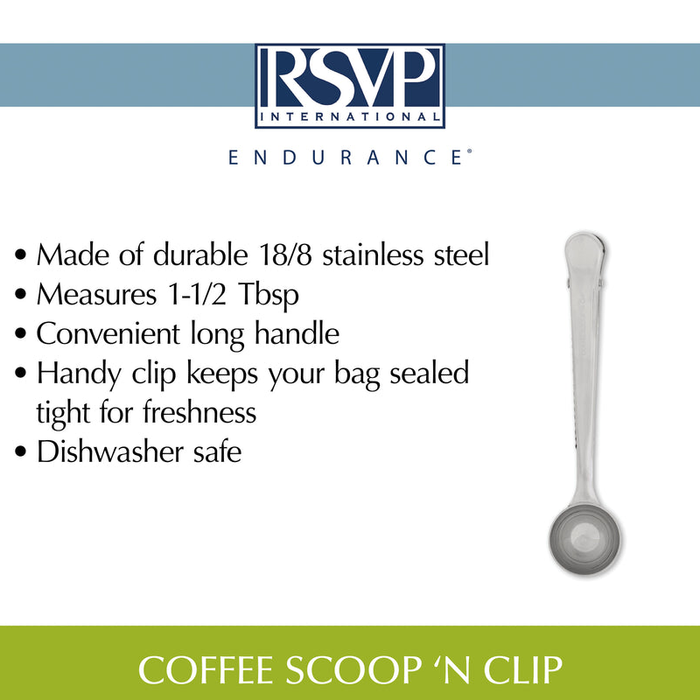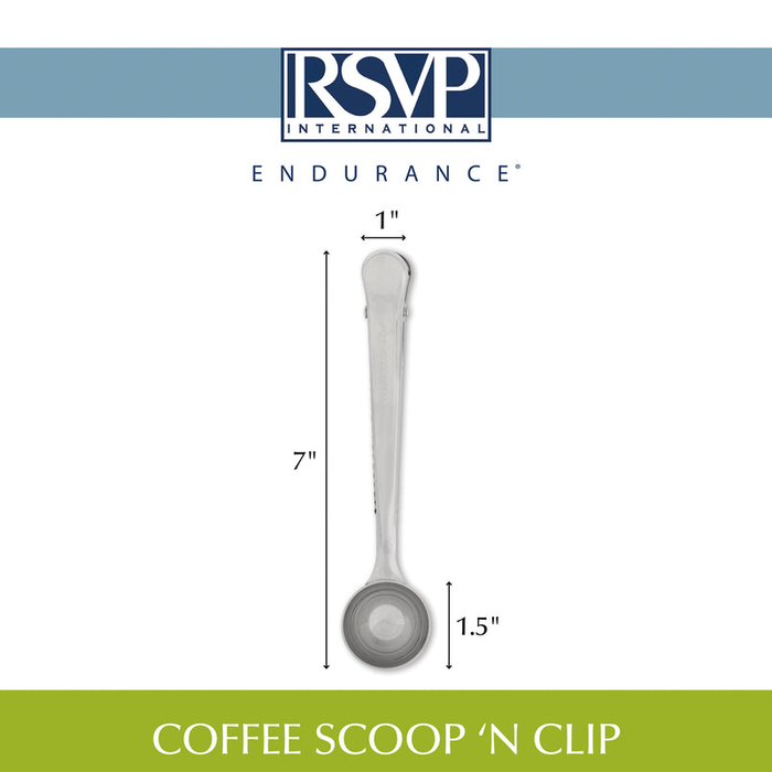The RSVP Coffee Scoop'N Clip just gets it. We coffee drinkers need a clip to keep our coffee bags sealed - and we need a scoop that we don't have to hunt for. The Coffee Scoop'N Clip does both, with a premium 18/8 stainless steel construction, ample 7" length and an attached long aligator clip device that seals bags tight. Simple, sensible and dishwasher safe.