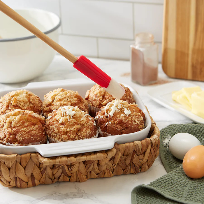 The RSVP Skinny Silicone Spatula is an odd-looking little specialist that you'll honestly wonder how you ever got along without. The very narrow flexible silicone head is perfectly shaped to scrape any food jar, processor bowl or blender clean, or gently separate baked goods from the pan, or drizzle a delicate lace of icing or sauce with precision. A quality beechwood handle and 12" overall length offers excellent control and reach in use. Hand wash to preserve the handle over the long term, or simply remove the head for washing.