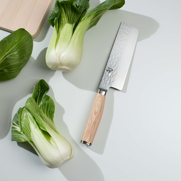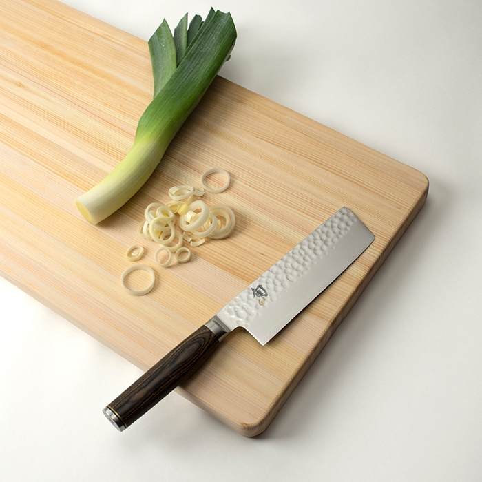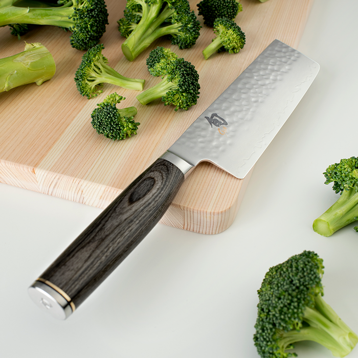 The Shun Premier Nakiri is the ultimate vegetable prep knife. This pretty little sharpie excels at home veg prep. Its light, thin ground blade and ultra sharp VG-Max core is perfectly suited to knock out super clean slices and sharp-corner dice all day long. This traditional Japanese profile and size is ideal for the home kitchen.