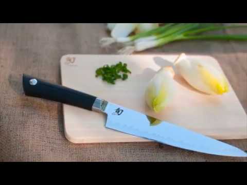 The Shun Sora Chef's knife is the perfect entry point into premium Japanese cutlery. Both the 6" and 8" sizes are a revelation of beauty, versatility and performance. The gyuto profile has a straighter edge than a western chef's knife, but it upturns as it approaches the tip, giving ample curvature for rocker-style chopping. The thin tip and fine edge cut with effortless precision and the super hard (60-61 Rockwell) VG10 edge will stay sharp much longer than high carbon stainless steel cutlery. Made in Japan. Hand washing is recommended. Includes Shun's 10-year limited warranty.