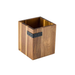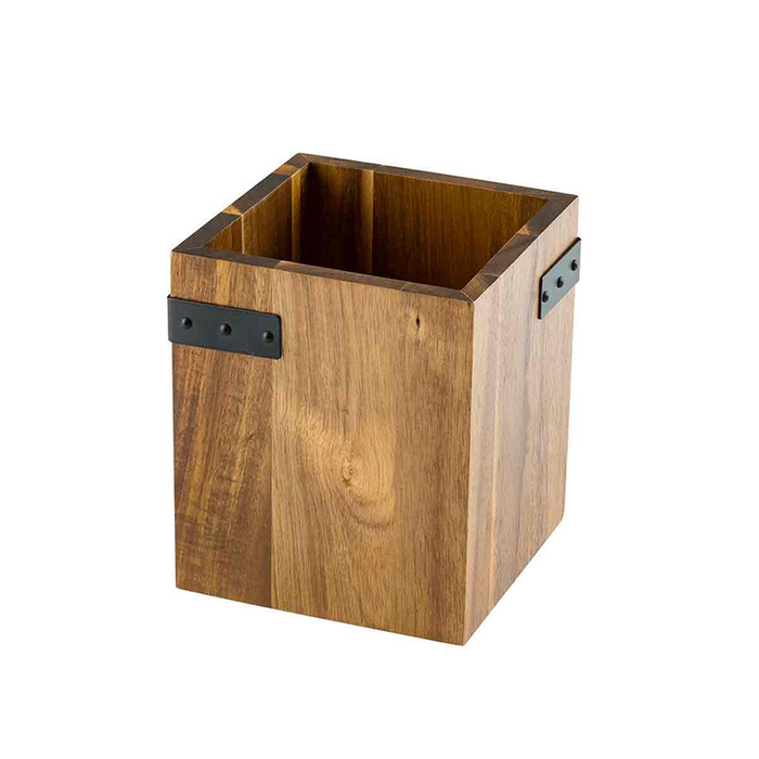 Upgrade your serving presentation with TableCraft's Industrial Collection Acacia Cutlery Holder. The mixed material design adds a lot of style to buffets and casual table settings indoors and out. Natural Acacia wood provides warm, earthy texture, while metal piping and rivets add modern, mechanical elements. The 5.25" l x 5.25" open box design is ideal alone or in multiples to hold utensils and other food service necessities.