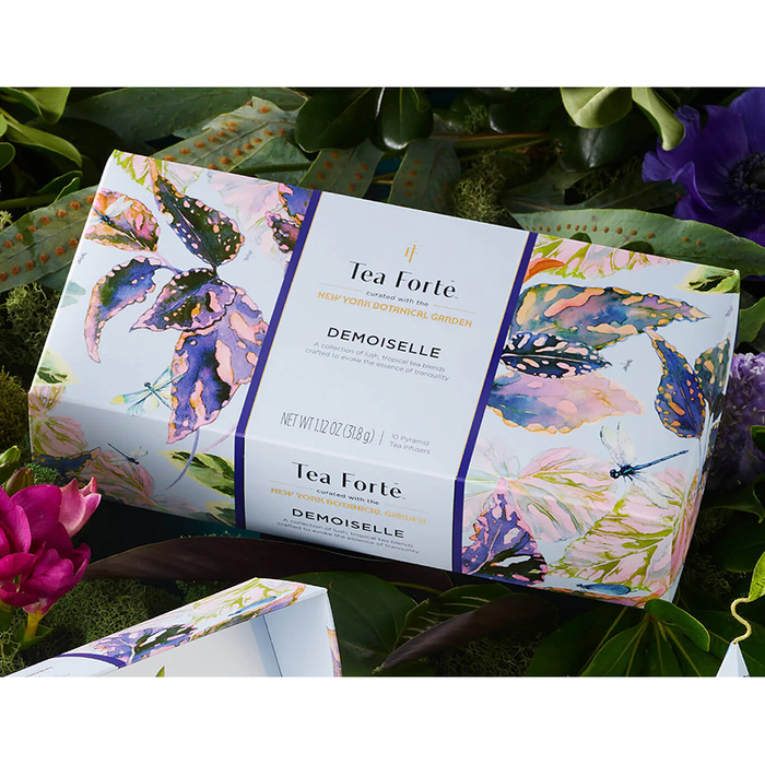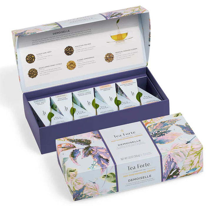 In collaboration with The New York Botanical Garden (NYBG), the Tea Forte Demoiselle Tea Assortment Petite Box transports you to a realm of tropical tranquility. Zesty Citrus Earl Grey (black tea) and grounding Mountain Oolong (oolong tea) to succulent Wildflower Honey Citrus (green tea), tantalizing Ginger Lemongrass (herbal tea), and — exclusive to the Demoiselle Collection — Tropical Passion Flower (herbal tea) with notes of exotic fruits. All blends in this collection are Kosher certified. A percentage of proceeds supports NYBG's work in plant research and conservation, horticulture, and education. The open lid reveals a detailed tasting menu.